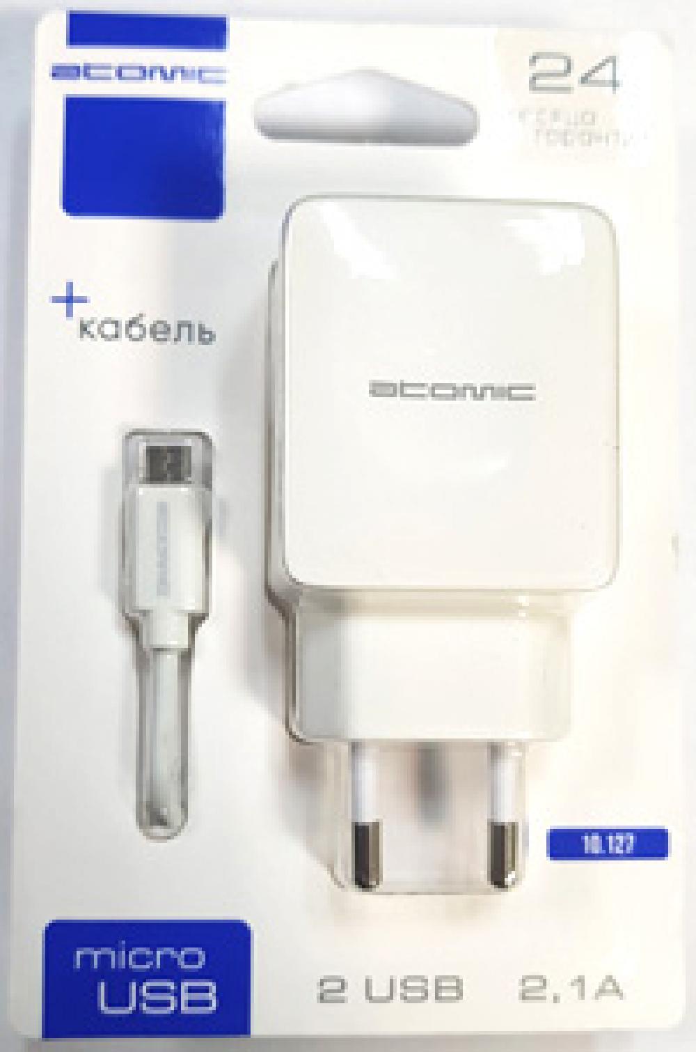 Сетевое зарядное устройство Atomic U500, 2USB-A, 2.1A с кабелем micro-USB, цвет белый